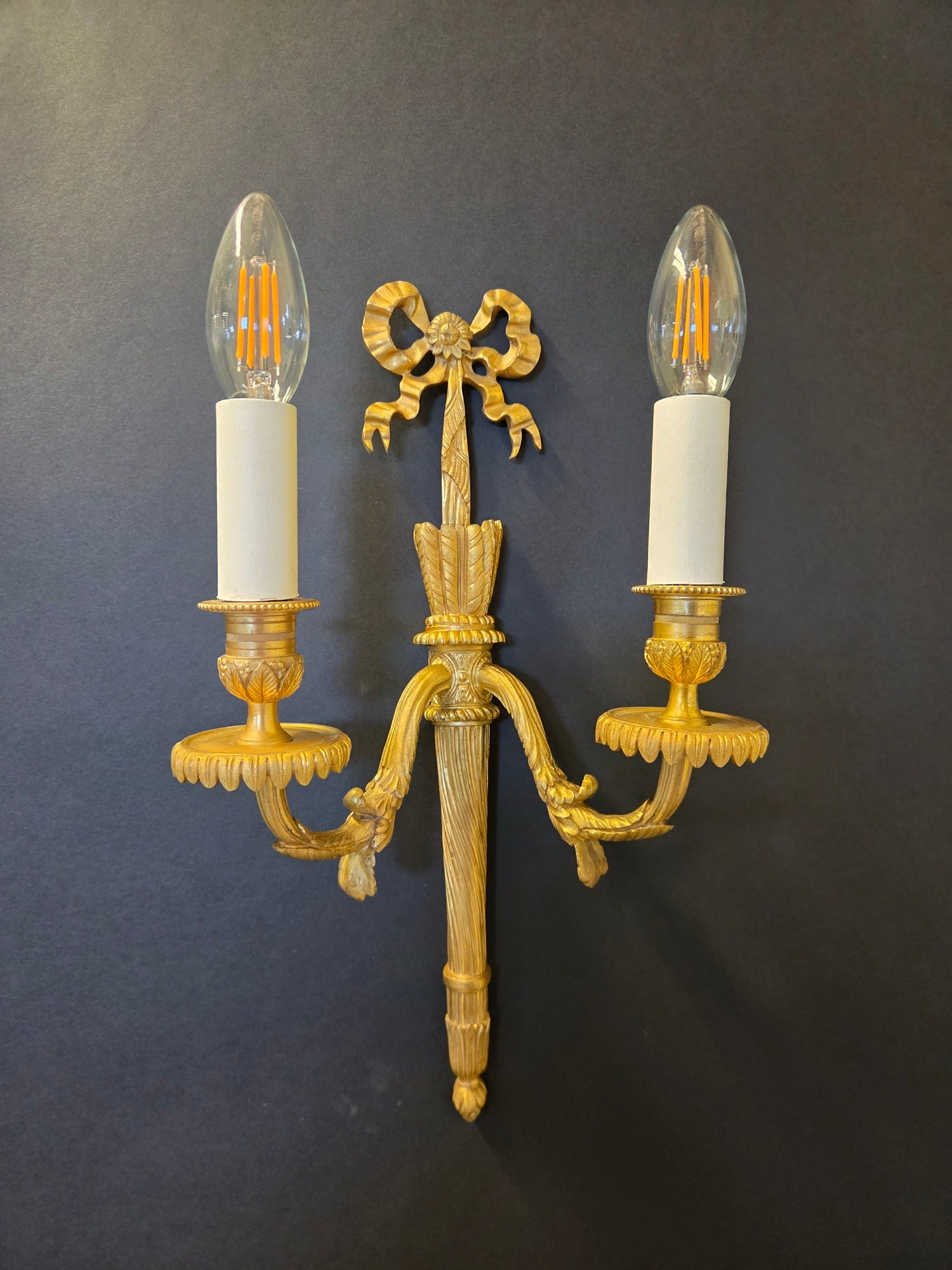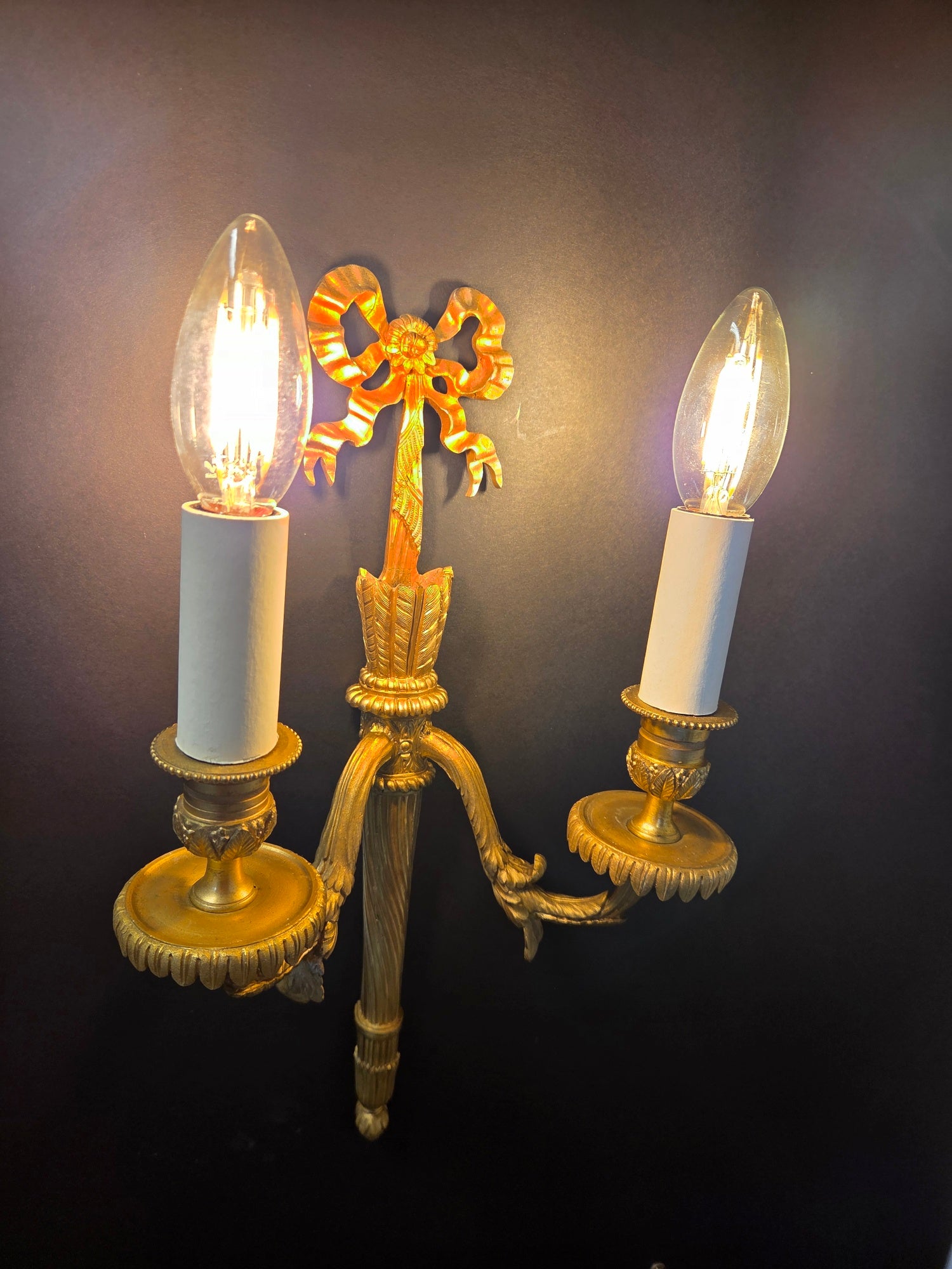 This is a fine pair of ormolu two-arm French Louis XVI revival bow & tassel wall lights. With their extended backplate, they have a rich and gilded appearance.