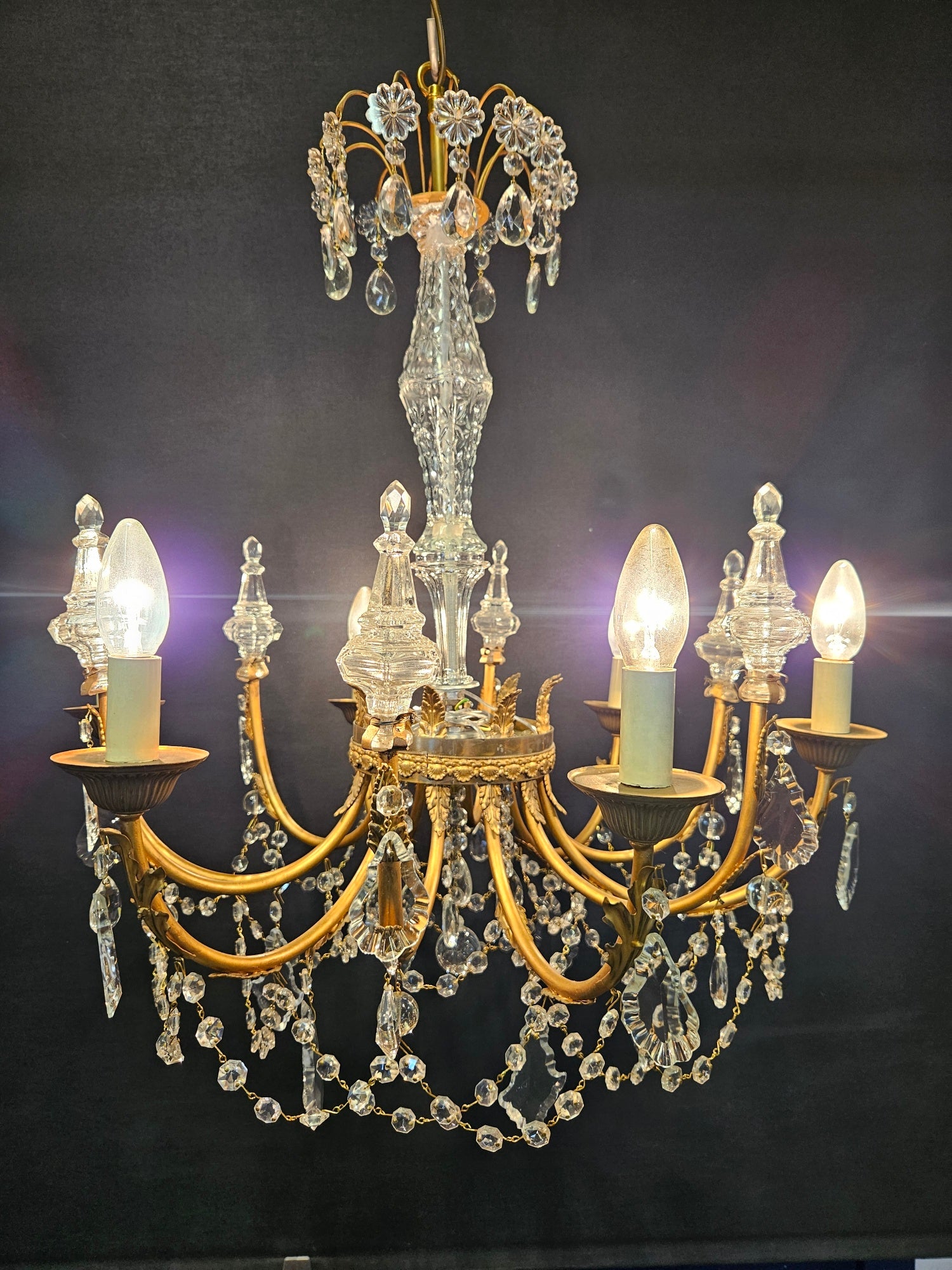 The 6 arms are interspersed with 6 finials, and all 12 are decorated with brass acanthus leaves. The stems of both chandeliers are made up of three moulded glass pieces, in addition, rosettes and pear drops hang from the top crown.